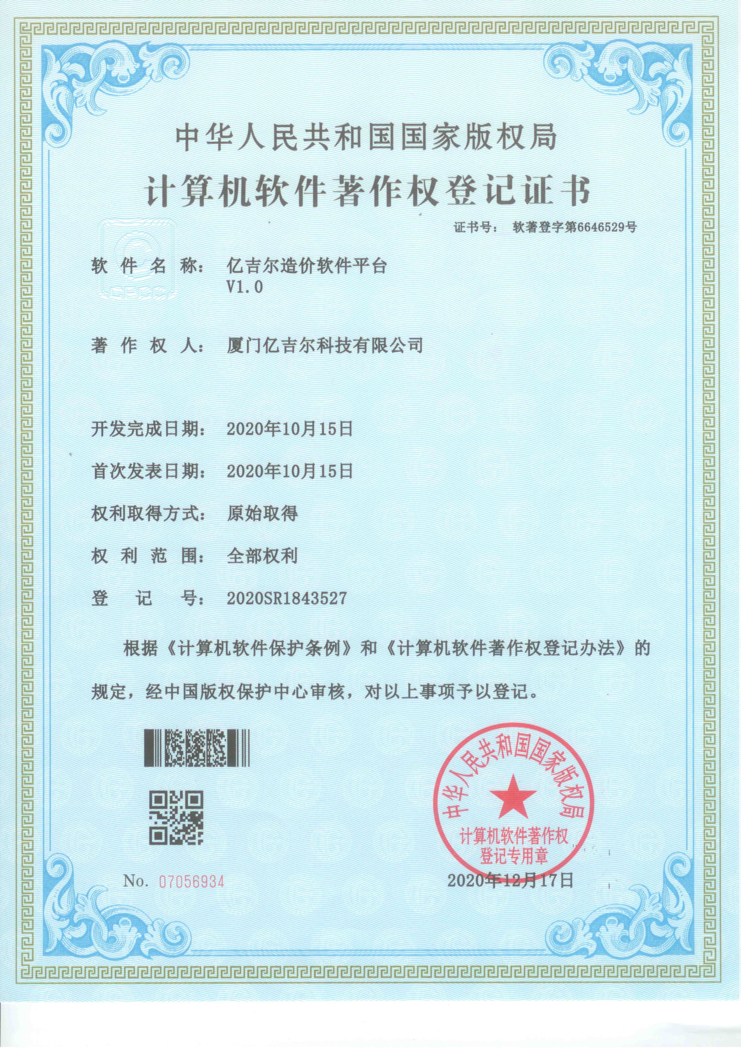 億吉爾造價(jià)軟件平臺(tái)著作權(quán)登記證書(shū) 發(fā)布日期:2023年11月22日 瀏覽次數(shù):2215 關(guān)鍵字: 公司 1/1億吉爾造價(jià)軟件平臺(tái)著作權(quán)登記證書(shū)
