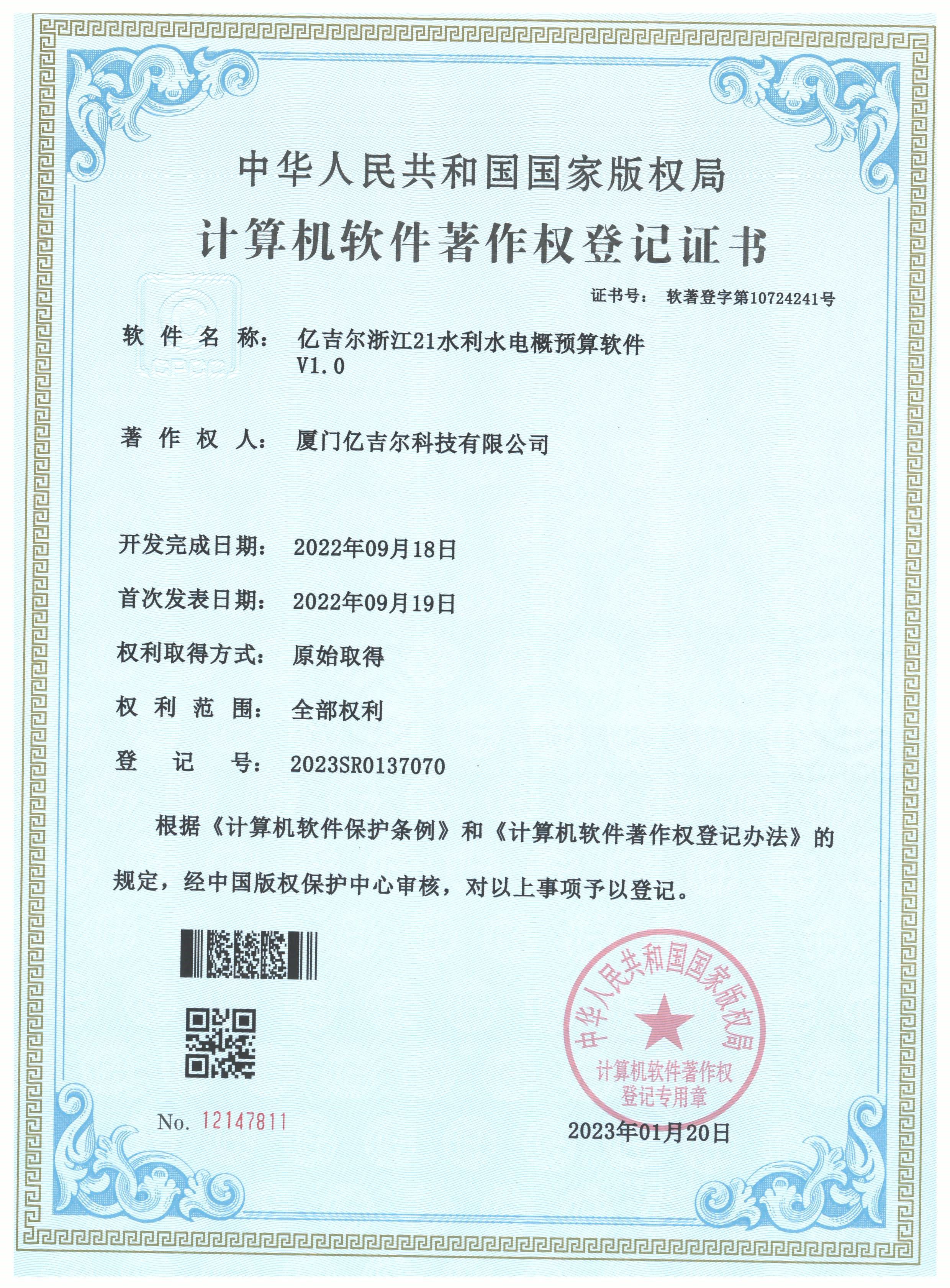 億吉爾浙江21水利水電概算軟件登記證書 發(fā)布日期:2023年11月22日 瀏覽次數(shù):2216 關(guān)鍵字: 公司 1/1億吉爾浙江21水利水電概算軟件登記證書(2022R11L1869444)