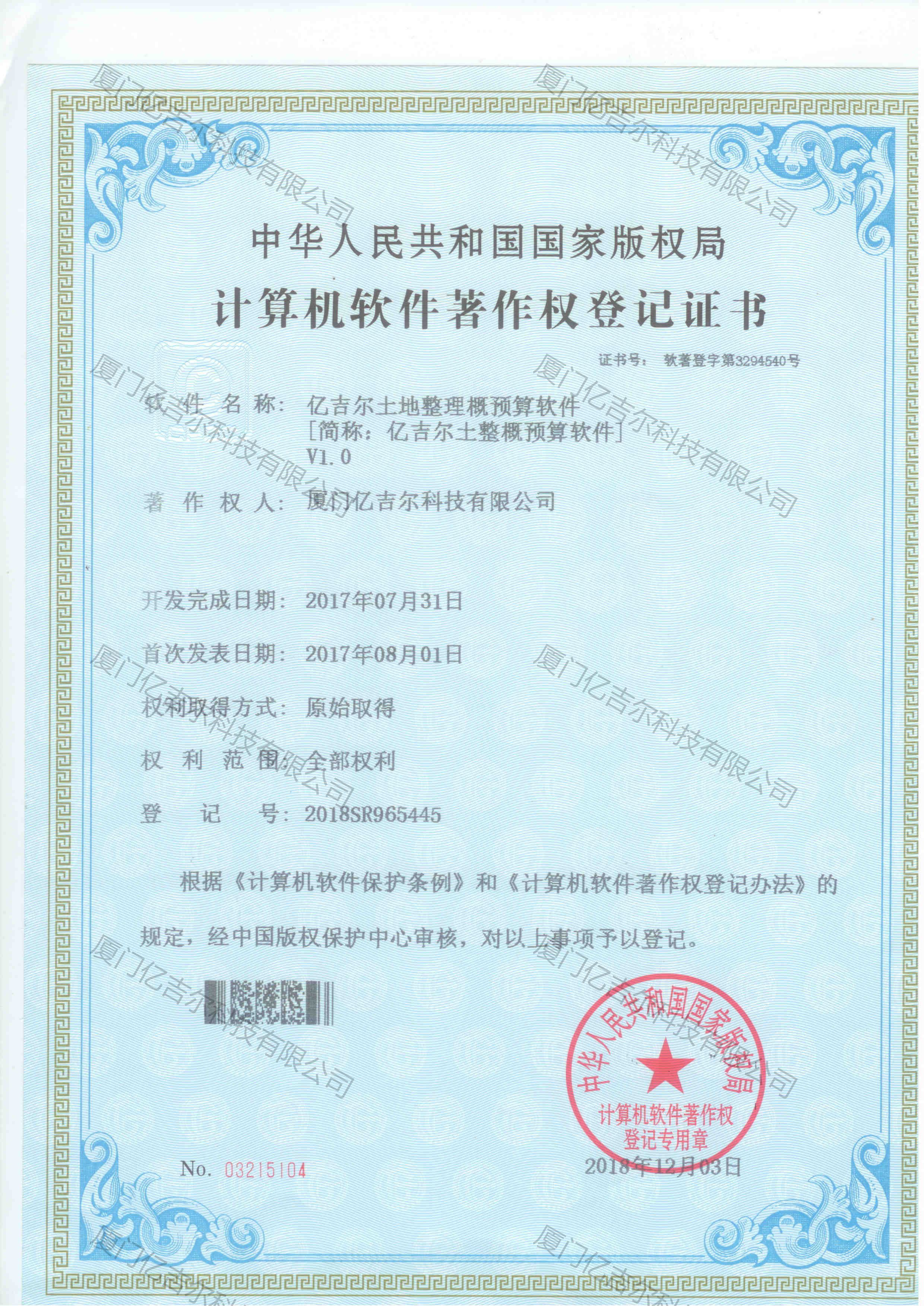 億吉爾土地整理概預(yù)算軟件著作權(quán)登記證書 發(fā)布日期:2018年12月03日 瀏覽次數(shù):3989 關(guān)鍵字: 公司 1/1億吉爾土地整理概預(yù)算軟件著作權(quán)登記證書